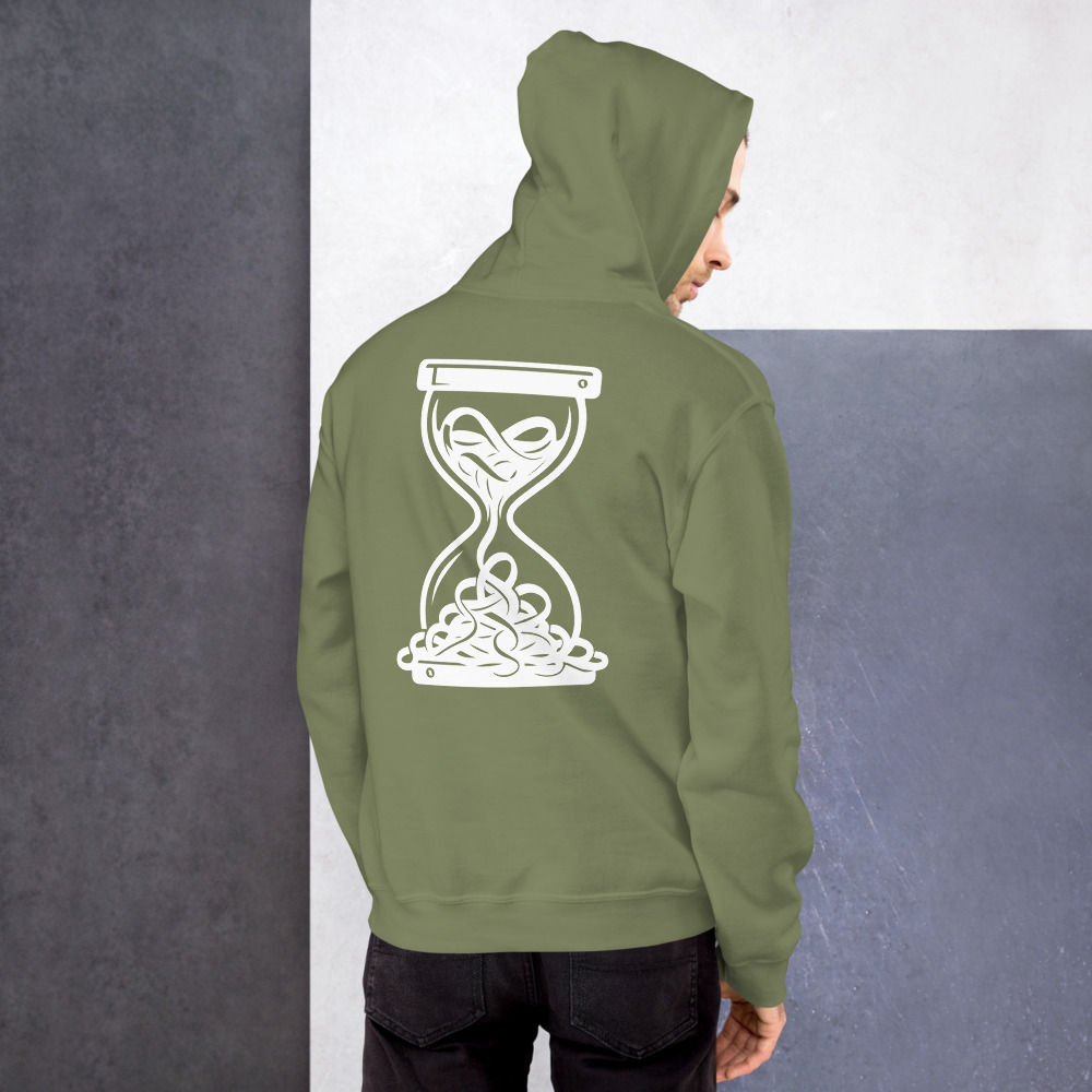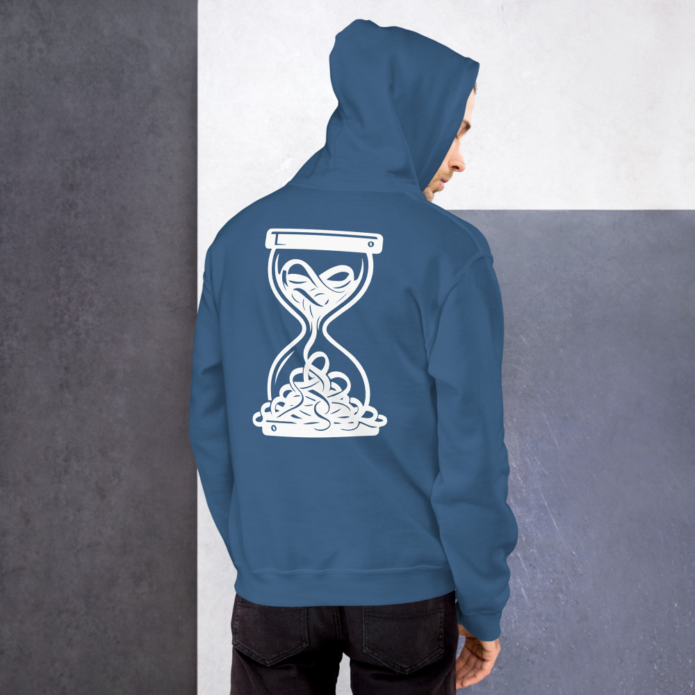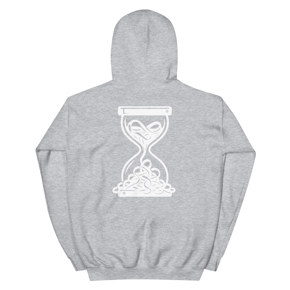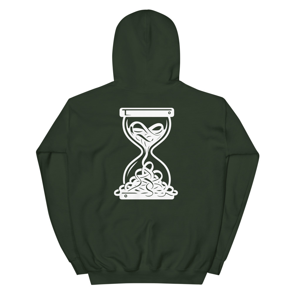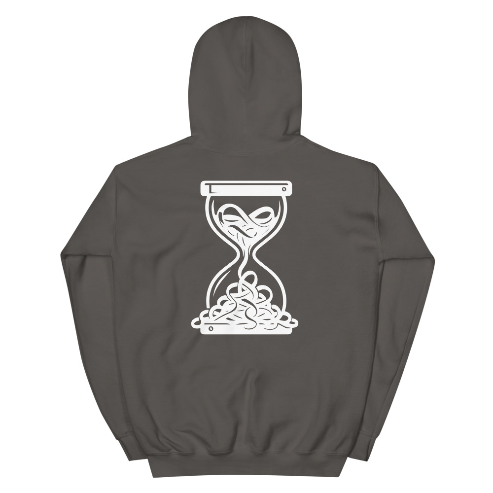 Back: a DTG-printed hourglass cradling cassette tape, counting down in spooled seconds.