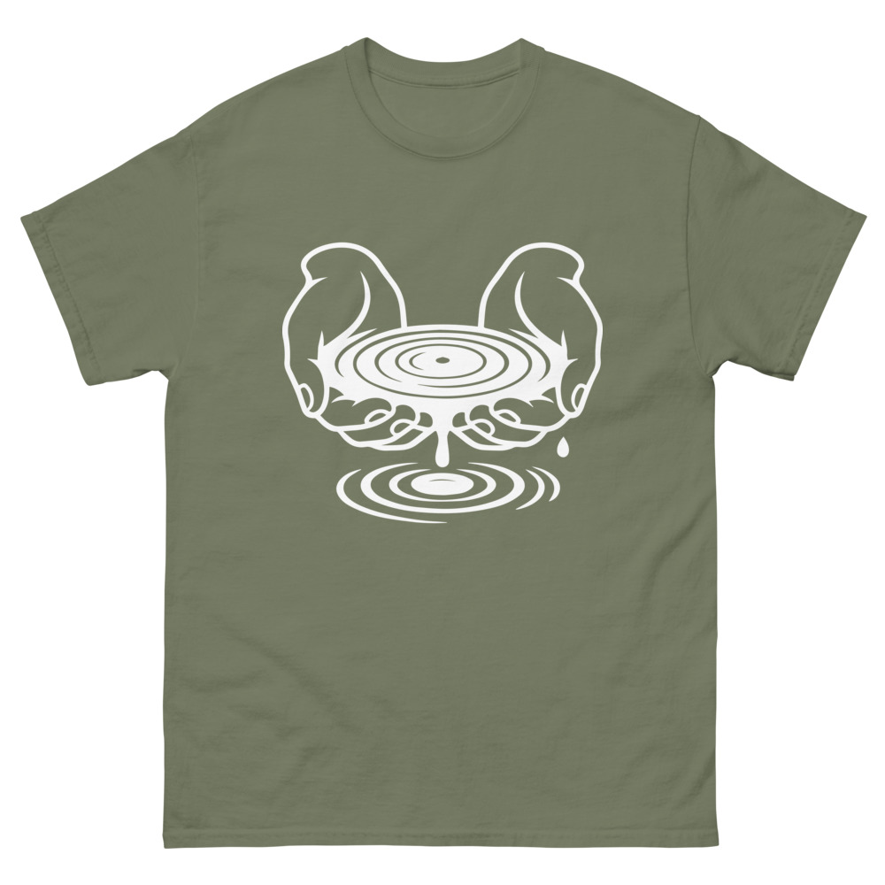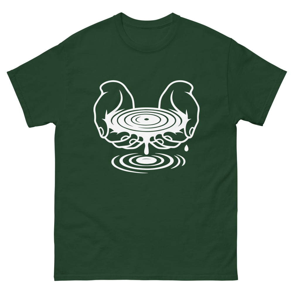 Front: a crisp DTG print of a vinyl record pool spilling through open hands sound turning liquid, dripping into the void. Printed on a structured 100% cotton tee that holds its shape, whether layered or worn solo. Sharp lines, heavy on presence.