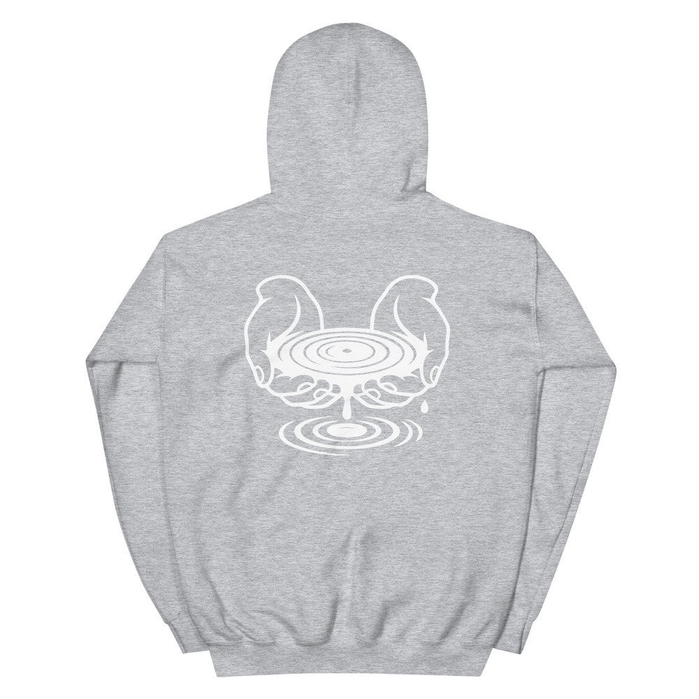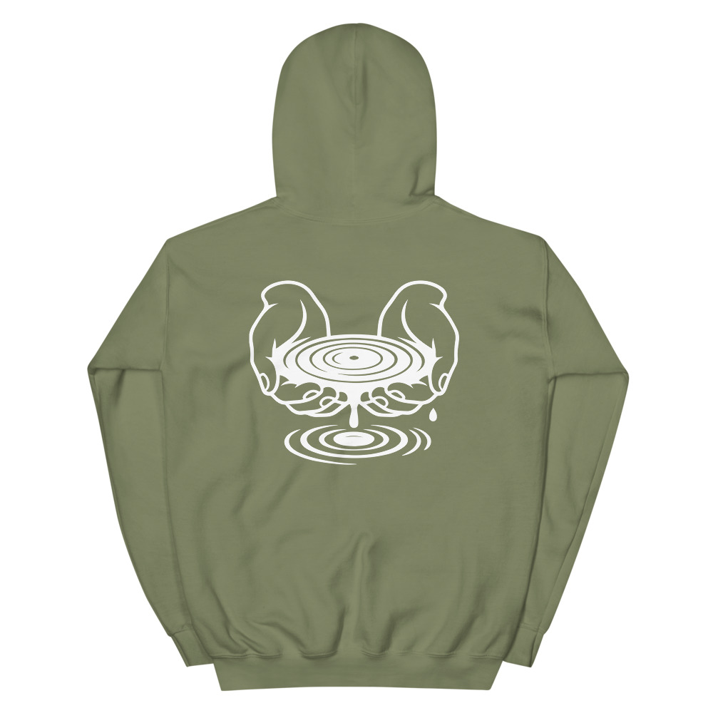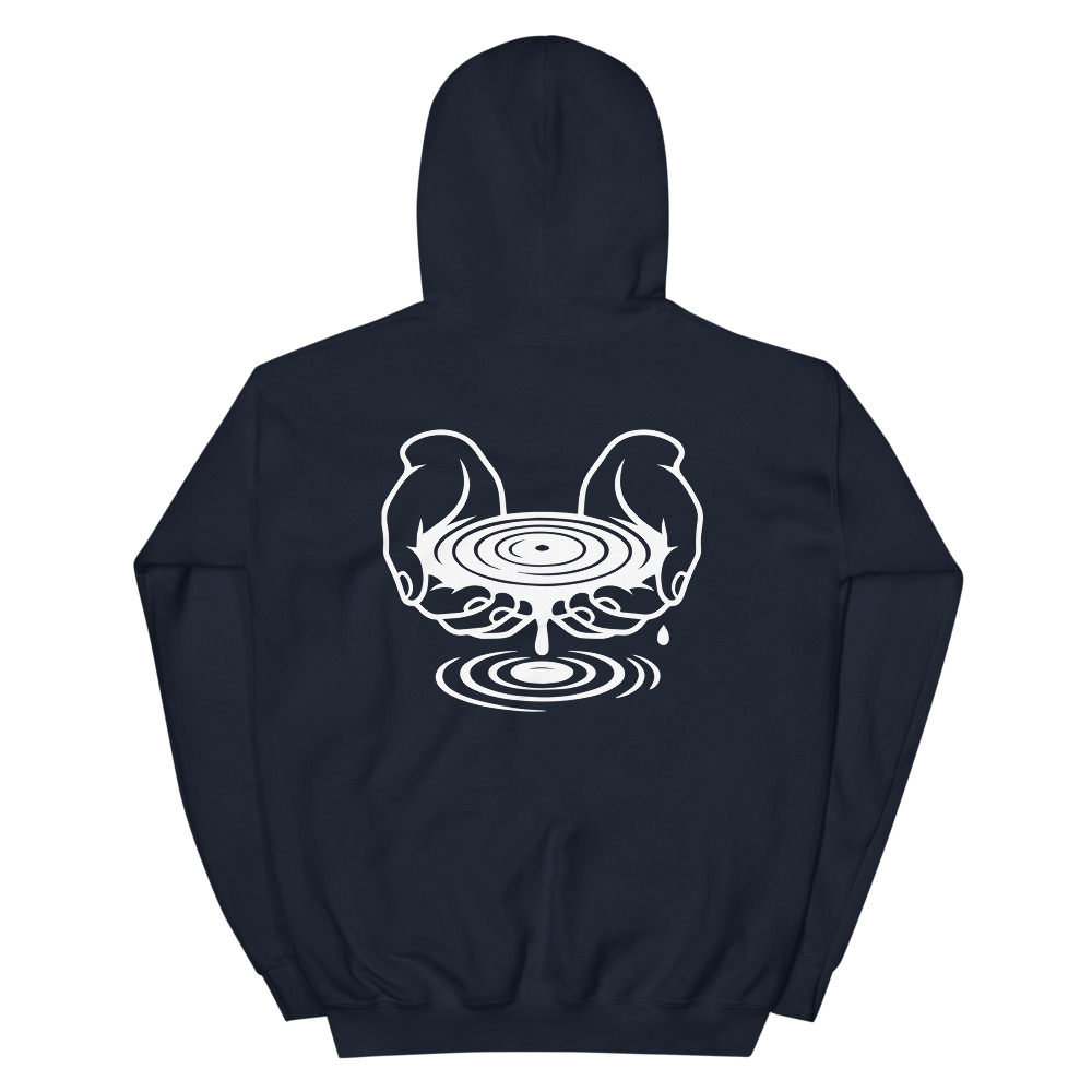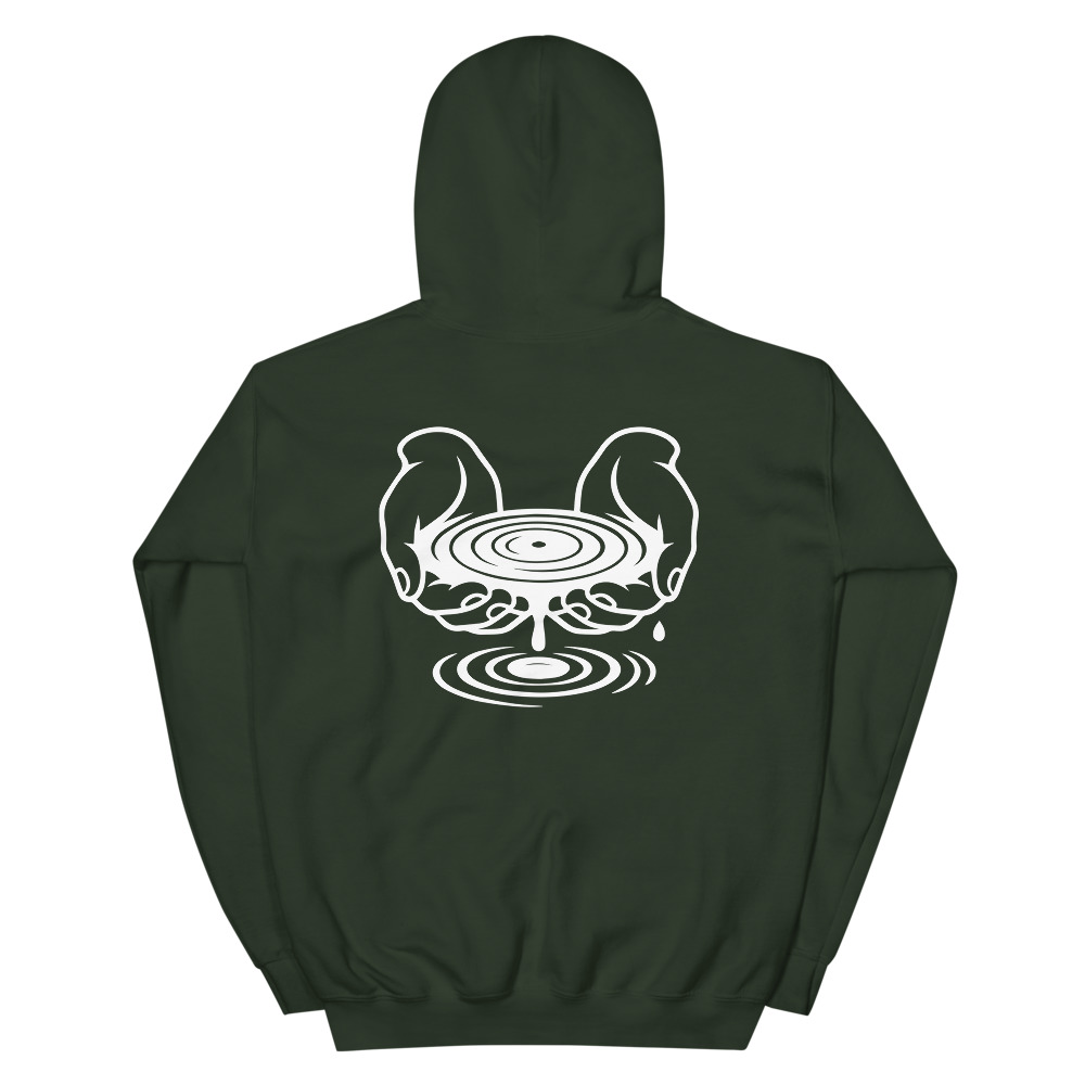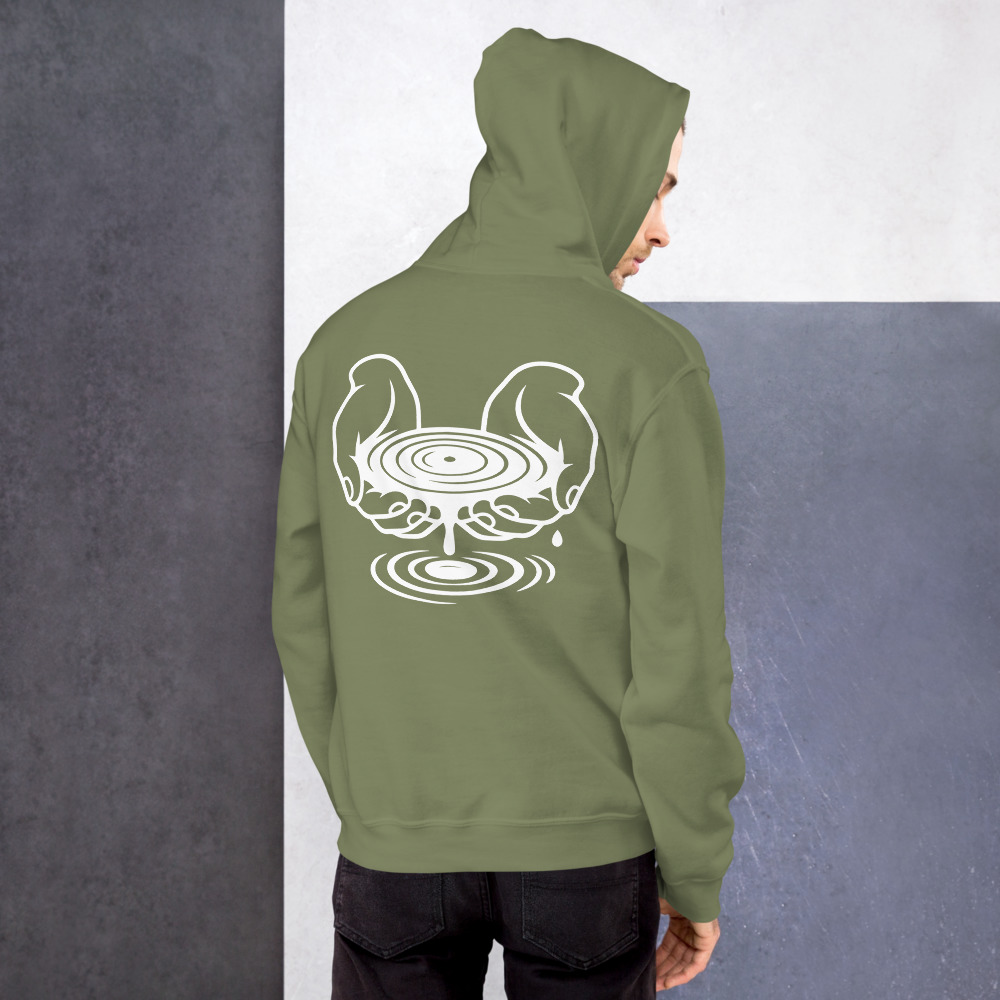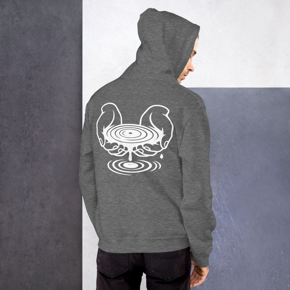 Back: a DTG print of a vinyl record pool spilling through open hands sound liquefied, slipping away in slow motion. Soft, heavy, and built for long nights and cooler air.